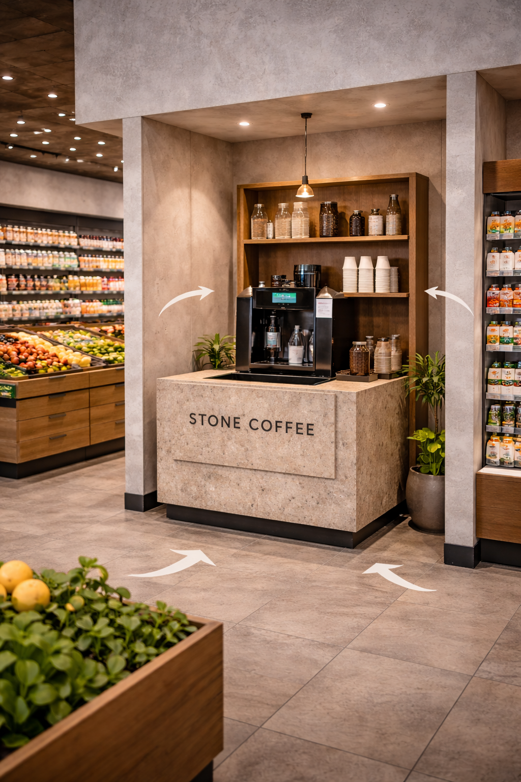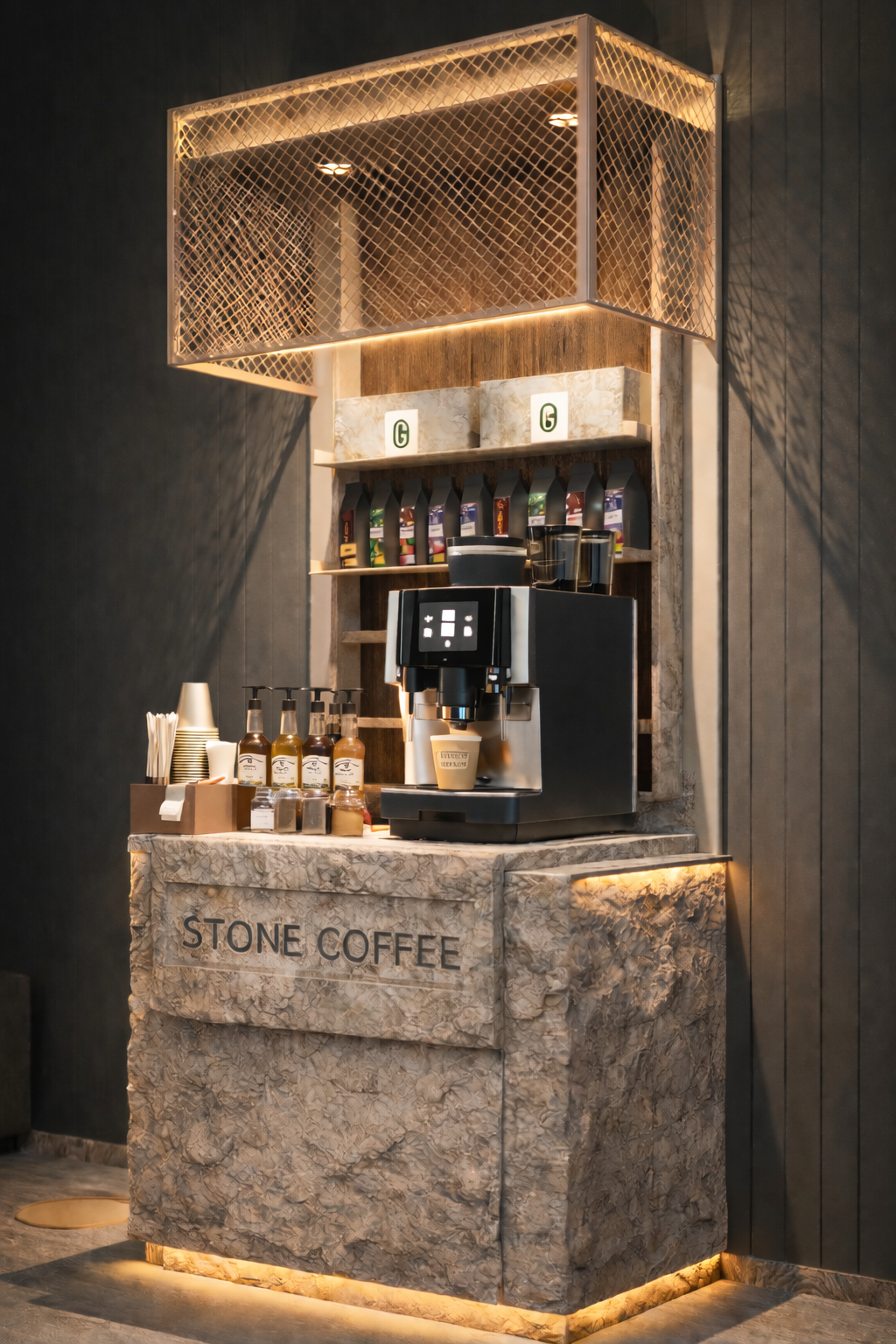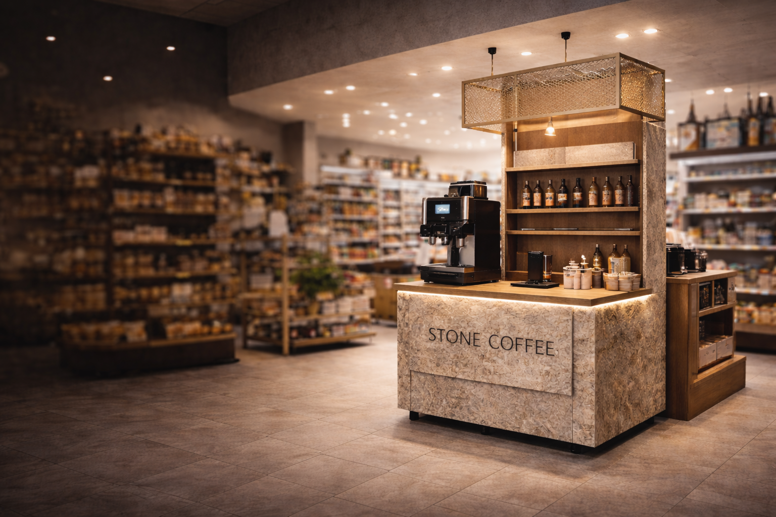 Coffee corner-ul STONE COFFEE ocupă până la 2 m² și se integrează natural în orice tip de retail, fără să încurce fluxul magazinului.