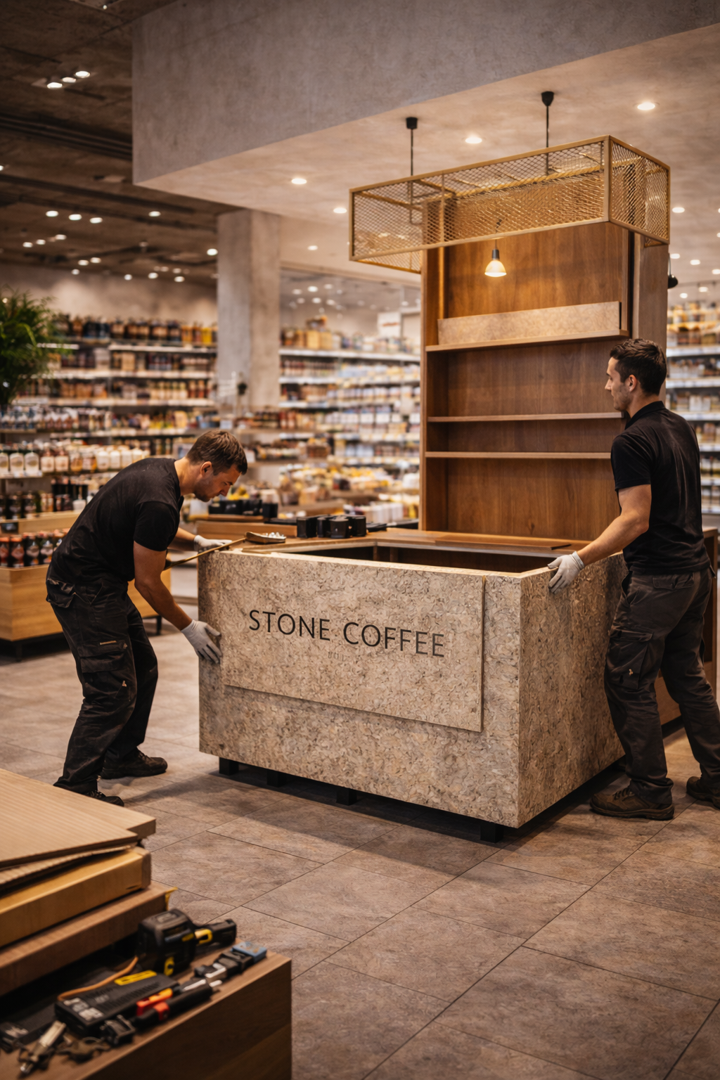 Mobilier modular, asamblat rapid de echipa noastră. Fără șantier, fără întreruperi, fără stres pentru magazin.