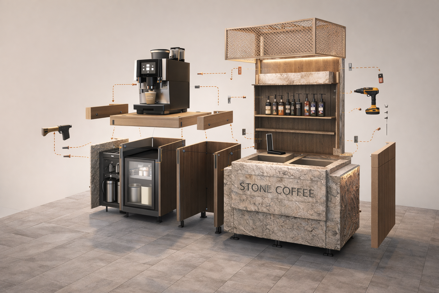 Coffee corner-ul STONE COFFEE ocupă până la 2 m² și se integrează natural în orice tip de retail, fără să încurce fluxul magazinului.